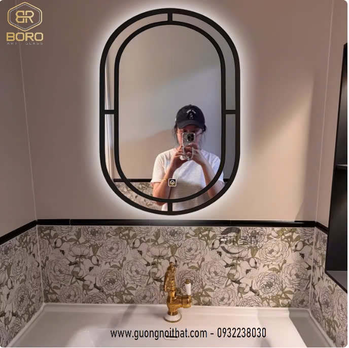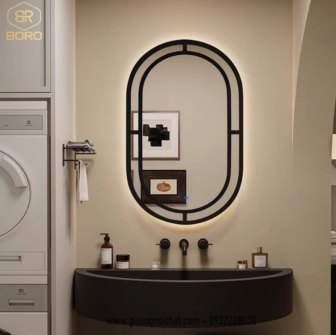 Gương khung gỗ trang trí hình oval 2 lớp có đèn led CNC115-LED, kích thước 60*90cm