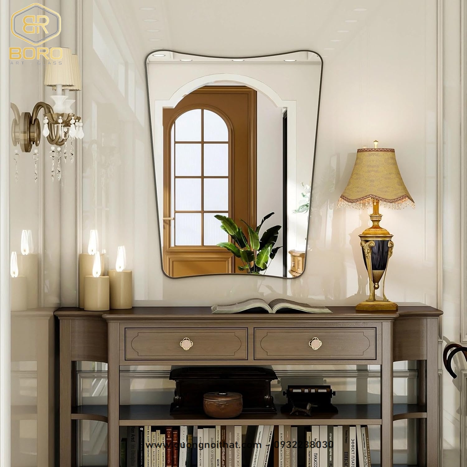 Gương nghệ thuật cong treo tường, gương khung inox INOXBR178, KT 55*80cm